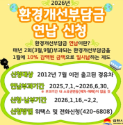 김천시는 환경개선부담금 부과 대상 경유 자동차를 소유한 자를 대상으로 2026년 1월 16일부터 2월 2일까지 환경개선부담금 일시 납부(연납) 신청을 받는다. 환경개선부담금은 관련 법에 따라 경유 자..