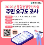 통영시는 2026년 통합건강증진사업의 효과적이고 실효성 있는 추진을 위해 오는 10일(월)부터 30일(일)까지 3주간 ‘통합건강증진사업 주민요구도 조사’를 실시한다. 이번 조사는 지역 주민이 직접 ?..